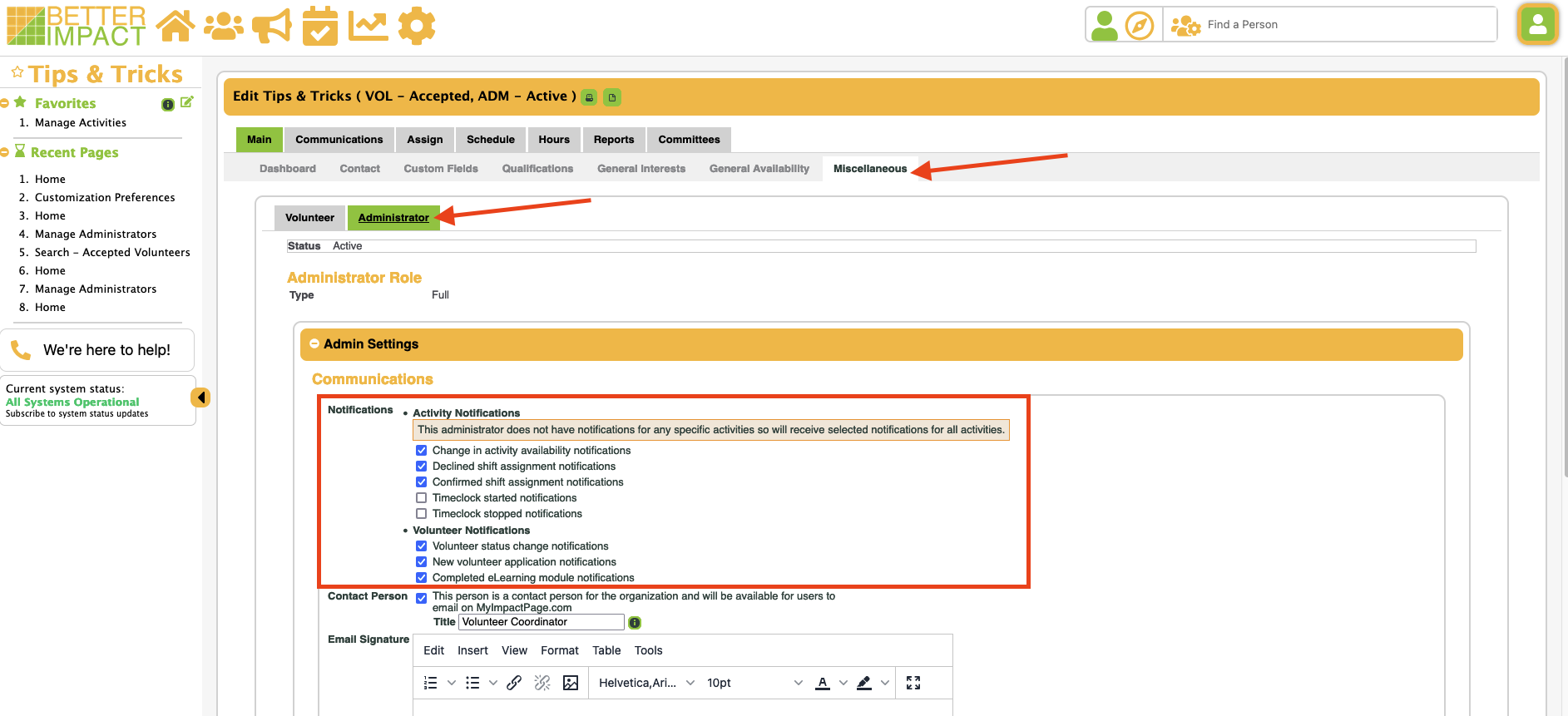 👉 Email Notifications: Admins can choose which email notifications they receive by checking the appropriate boxes in their own profile under Miscellaneous >> Administrator sub-tab. A few examples are: