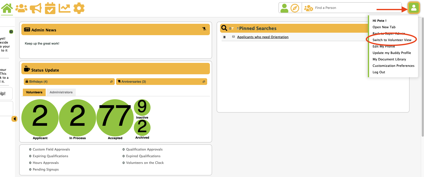 Switch to user view, select the profile icon in the top right of the screen and select “Switch to User View” or “Switch to Volunteer View”