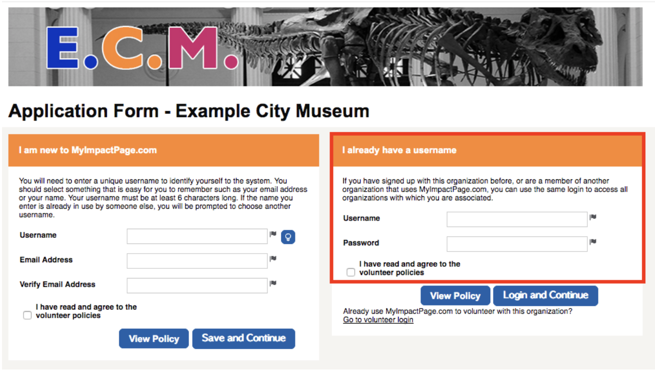 Users with an existing profile bypass the entry of their contact information. The application process will check to see if the volunteer has a date of birth (if required), phone number, and primary email address entered in their existing profile. It will also ensure that they have acknowledged your organization’s policies (if required).