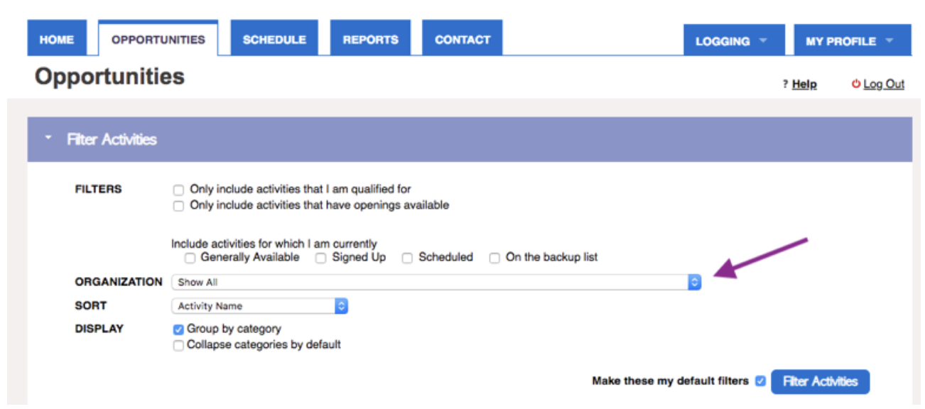 Select the options for Category, Application Form, Active Status, Hours Logging and Group Sign up. (Activity Report Group will also be available for members with an Enterprise Account).