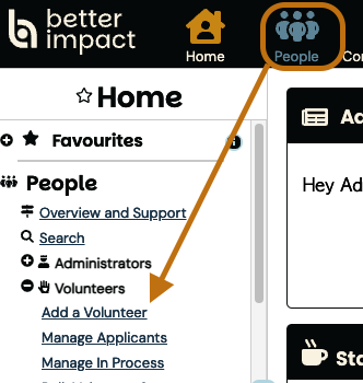 Go to: People, then click on “Add a Volunteer” found in the sidebar under Volunteers