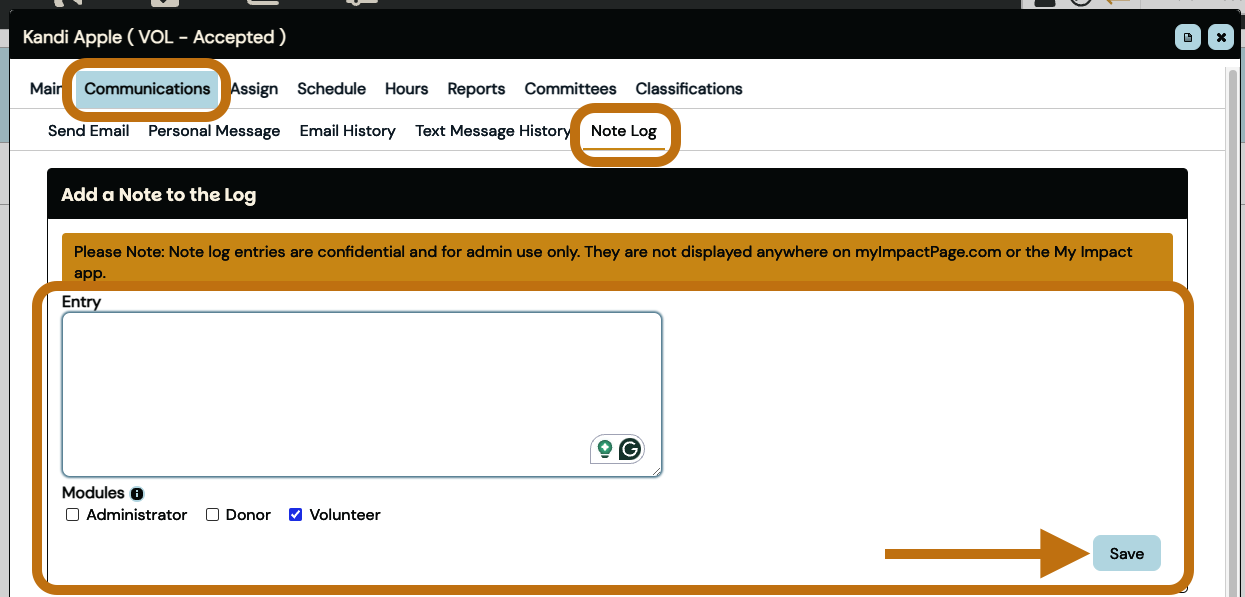 Optional: Compose a Personal Message to the user. This will be displayed to the volunteer on their MyImpactPage.com home page.