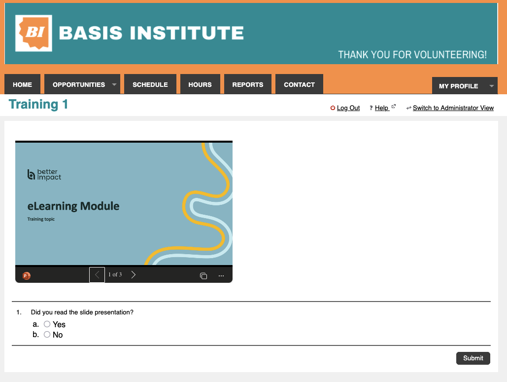 👉Deliver Content Easily: Embedding the slideshow into an eLearning module allows volunteers to view the content at their own pace before completing the assessment portion of the module.