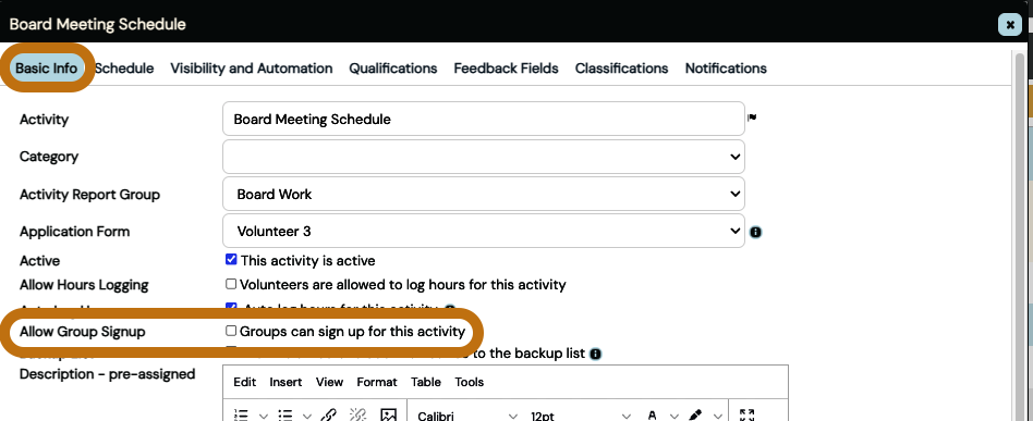 In “Basic Info”, check the “Allow Group Signup” box to enable groups to sign up for this Activity (removing the check from this box will prevent groups from signing up for this Activity).