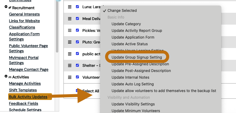 Go to: Configuration, then click on “Bulk Activity Updates” found in the sidebar under Activities