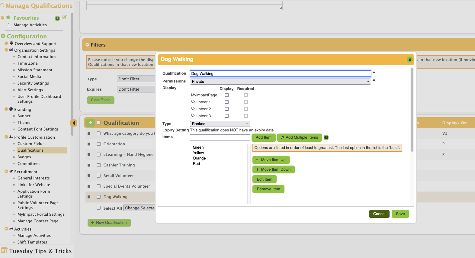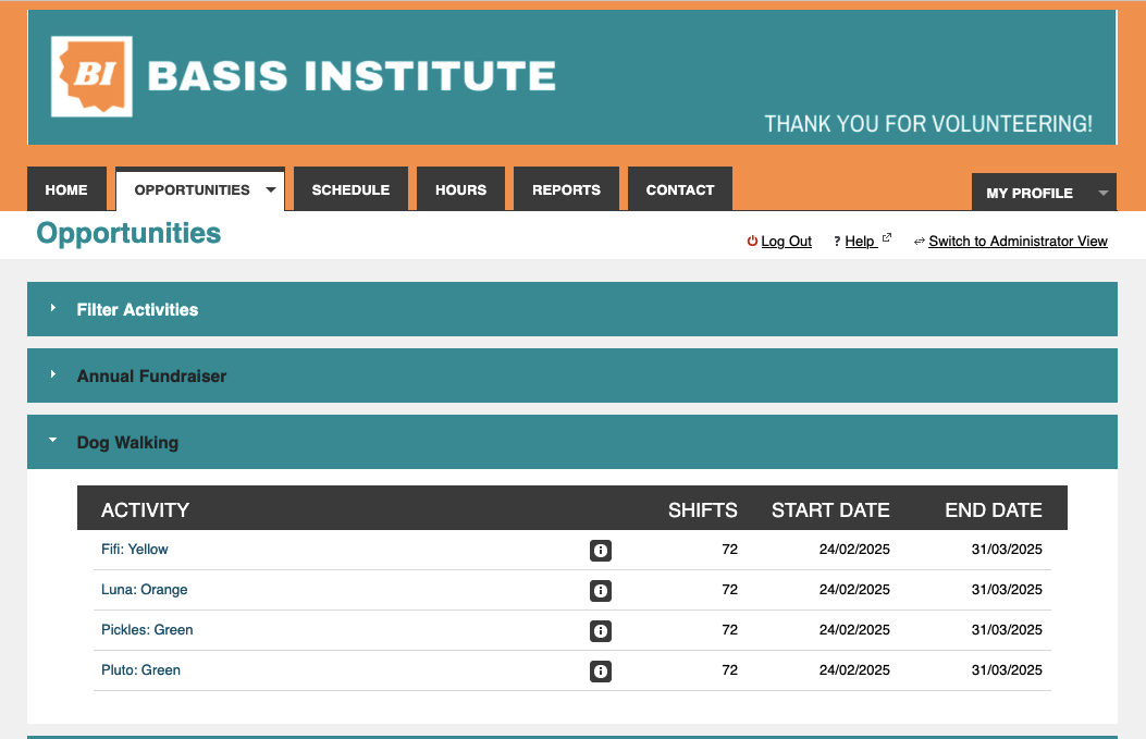 Activities: Each activity is set to the appropriate level in the Qualifications tab. The dog “Luna” is an Orange level, so it states that volunteers must have “at least” the Orange level to see this activity.