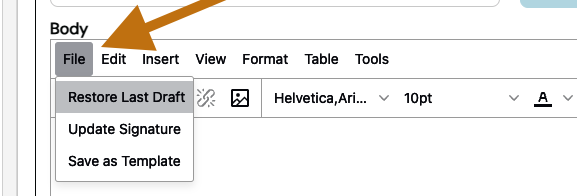 Updated over 5 months agoWhile composing an email, a draft of the body of the email will be saved locally so you can recall the draft if you get logged out or something else unexpected happens.