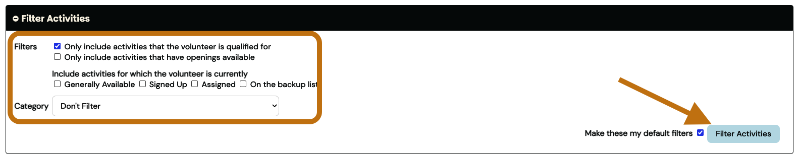 Optional: For long activity lists, use the filters in the top panel and click the green [Filter Activities] button. These selections can be made your default filters