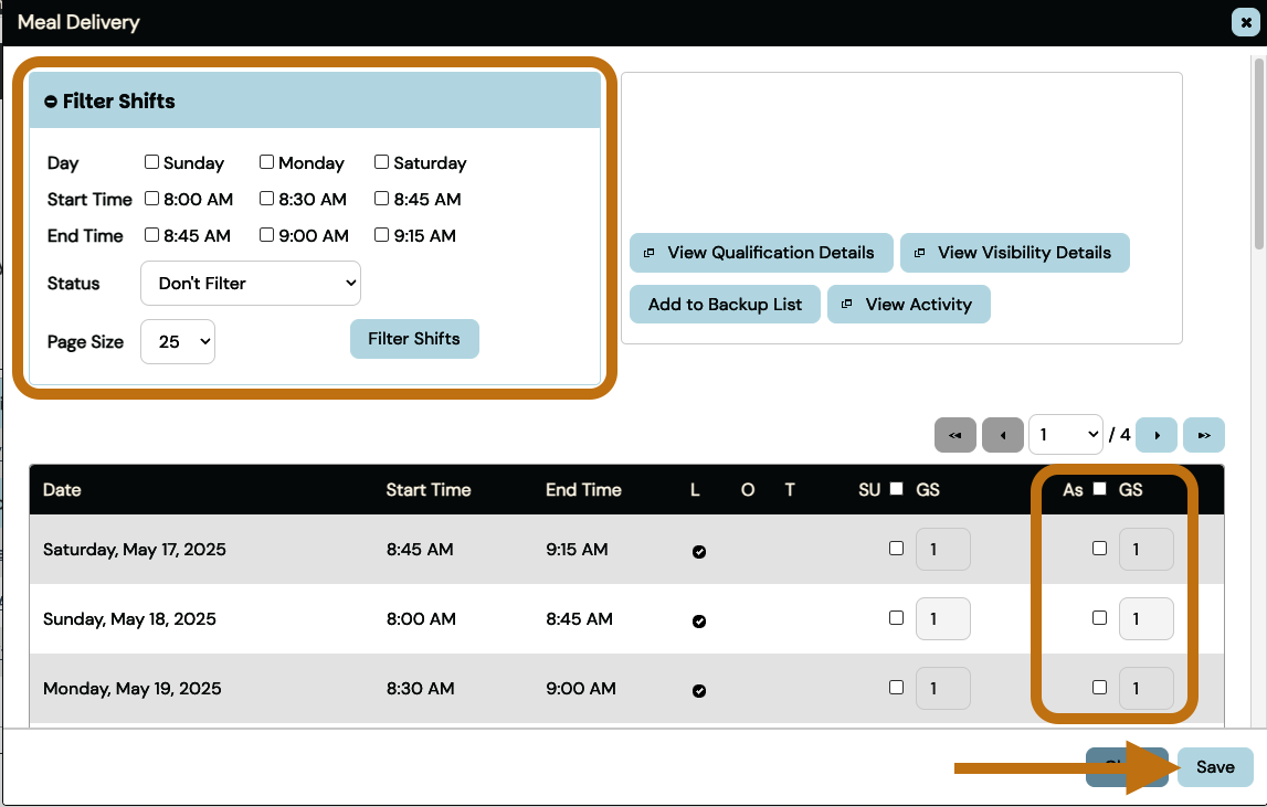 For scheduled Activities, you can use the “Filter Shifts” panel to find a specific shift(s)