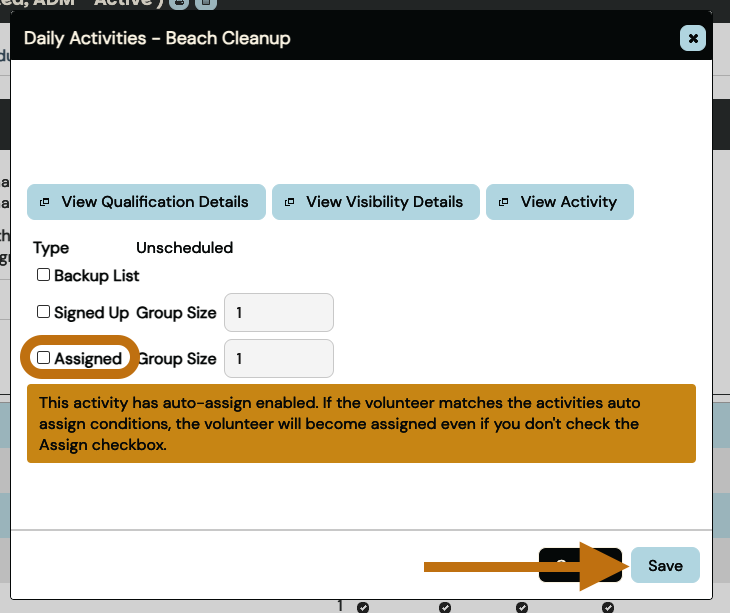 Click on the name of the activity; an ‘Assign Volunteers’ window will open