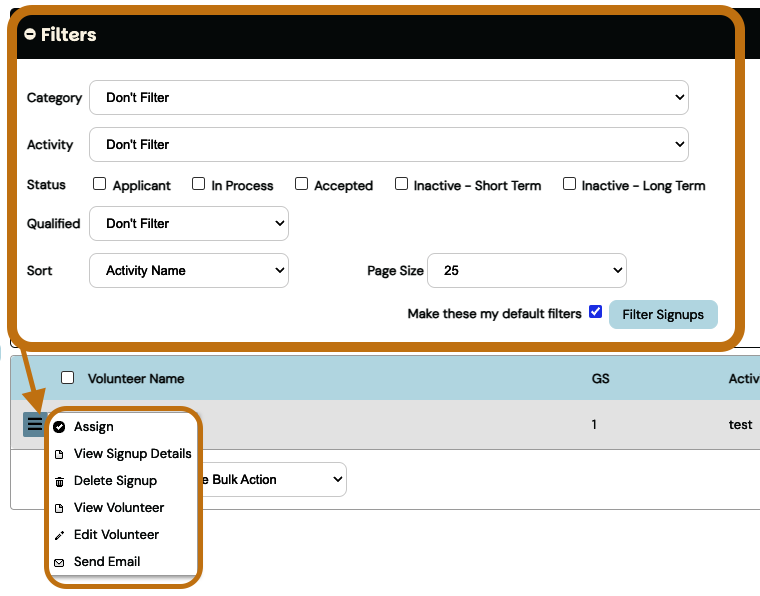 For long volunteer lists, use the filters in the top panel and click the green [Filter Signups] button