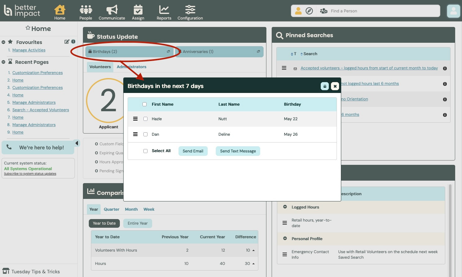 Select the volunteers and choose Send Email or Send Text Message at the bottom