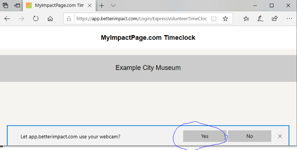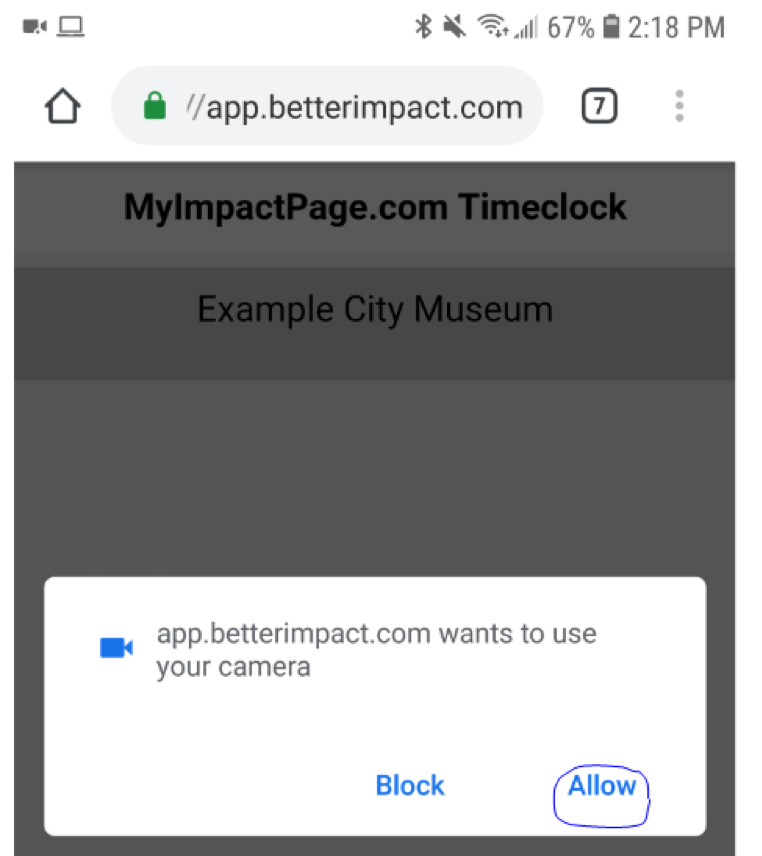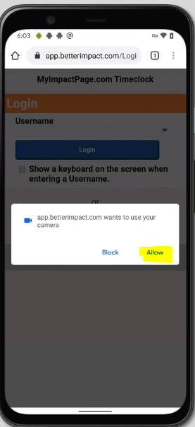 Navigate back to the express timeclock url, and make sure to select “Allow” when prompted for permission to use the camera.