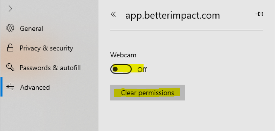 Toggle to “On” to always allow the camera, or click [Clear Permissions] to be prompted to allow the camera next time.