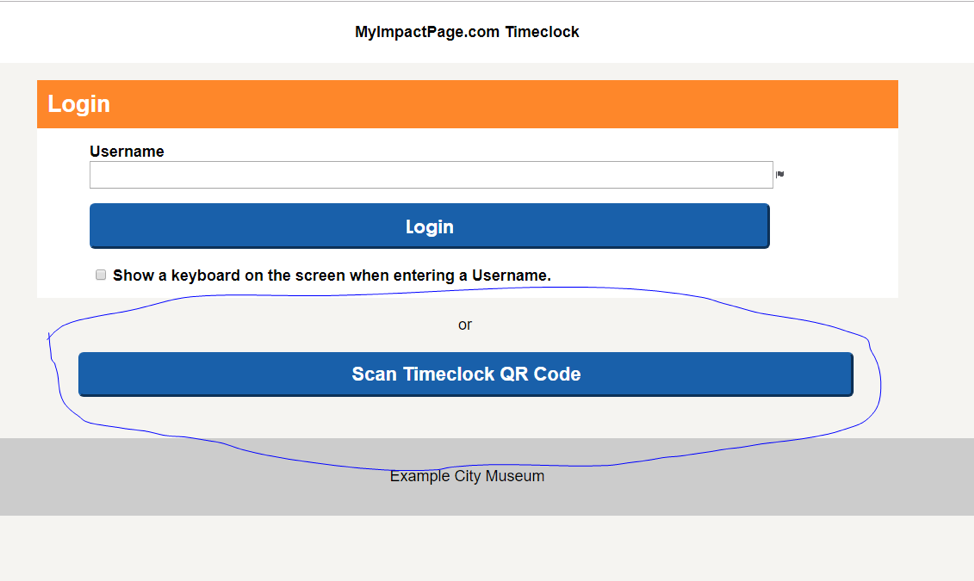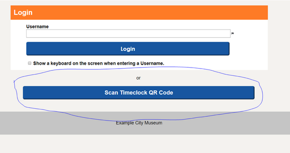 To default the express timeclock to using the camera/qr code functionality, simply click the [Scan Timeclock QR code] button. Going forward, the timeclock will remember that you have selected this mode, and will show it automatically.
