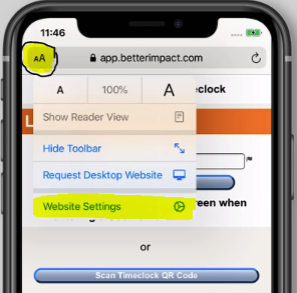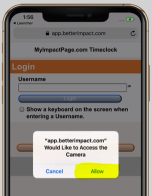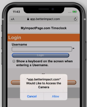 Open Safari and browser to your express timeclock address. If Prompted to allow access to the camera, select “Allow”