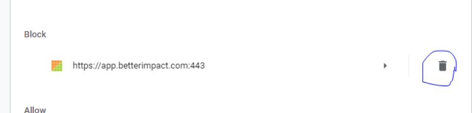 In the “Block” section. Click the Garbage can beside app.betterimpact.com.