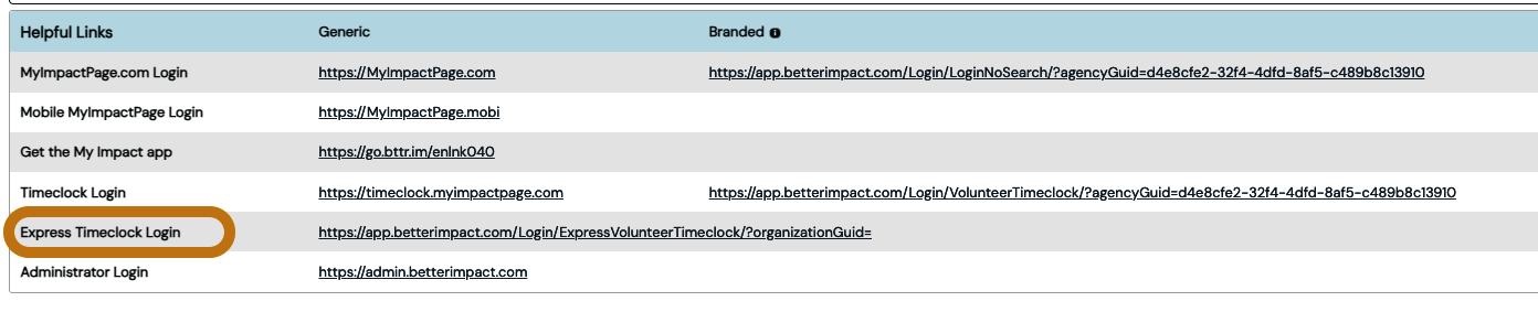Note: The express timeclock link is organisation-specific; as such, it is not possible to display all the organisations the volunteer belongs to, even if all belong to the same enterprise account.