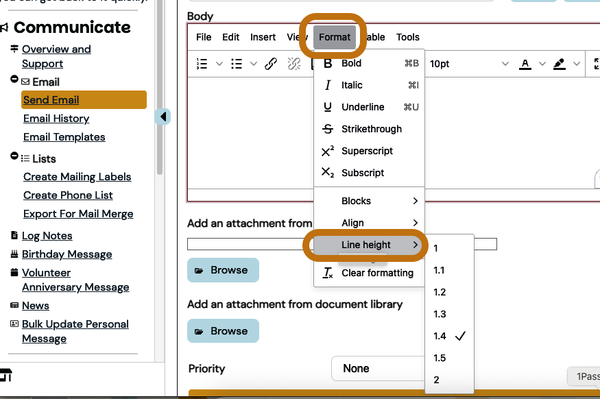 About this feature: Rich Text Boxes, found throughout the software, enable you to enter and format text in a variety of ways, including: Font family, Font size, Emphasis (text, colour, bold, etc.). In addition to text, links can be added and images embedded (videos may be inserted into any non-email text box).