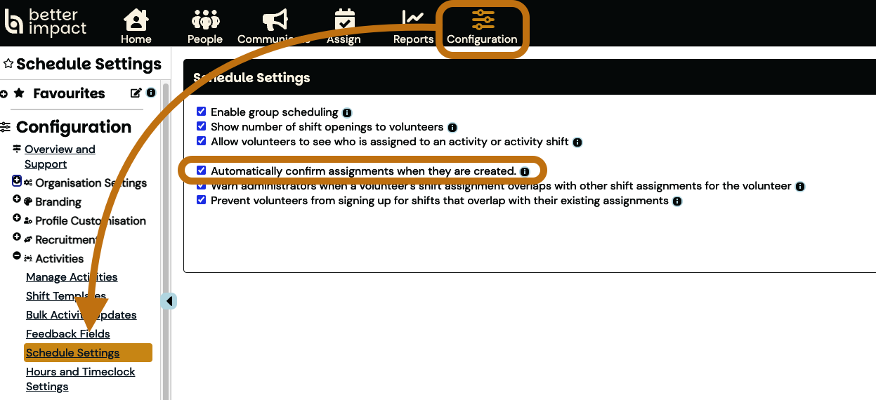 If unchecked, after you assign a volunteer or after a volunteer self-schedules, a short confirmation step will be required by the volunteer to ensure they understand that they are on the schedule. If checked, this step will not be required, and they will be treated as confirmed automatically.