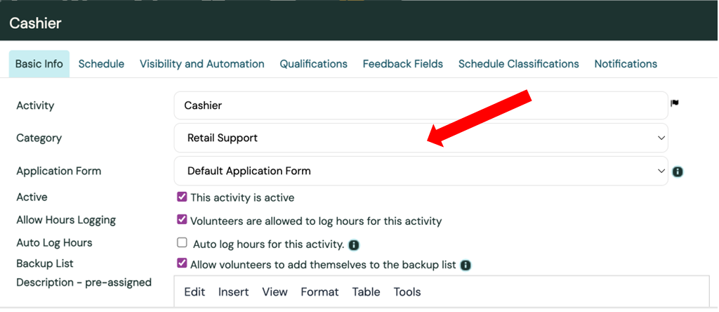 👉 Using Categories – When creating or editing an Activity, select the drop down to pick which category it belongs to.