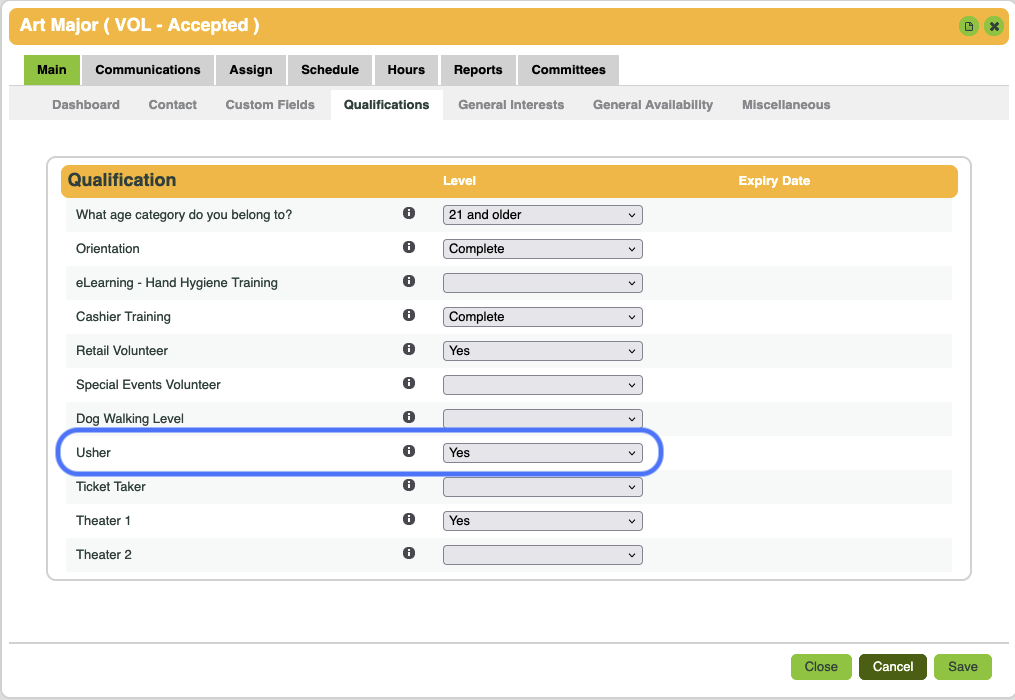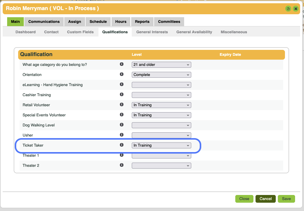 👉 Example: A theater may set up one qualification for each of the following roles and locations to help identify where that volunteer is placed. A volunteer would be labeled with the levels listed below as they train for each role: